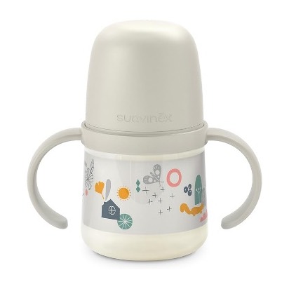Biberón con asas color gris 150 ml. Boquilla suave ideal para aprendizaje y con tapa protectora para evitar derrames +6 Meses